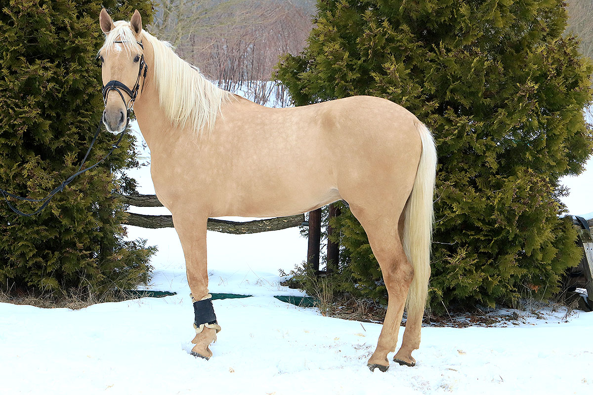 This 4-year-old Lusitano in a striking special color, palomino, stands at an impressive 1.70 m and is a true eye-catcher, effortlessly drawing all attention. His imposing presence, golden shimmer, and natural charisma make him appear as if he knows exactly how special he is.